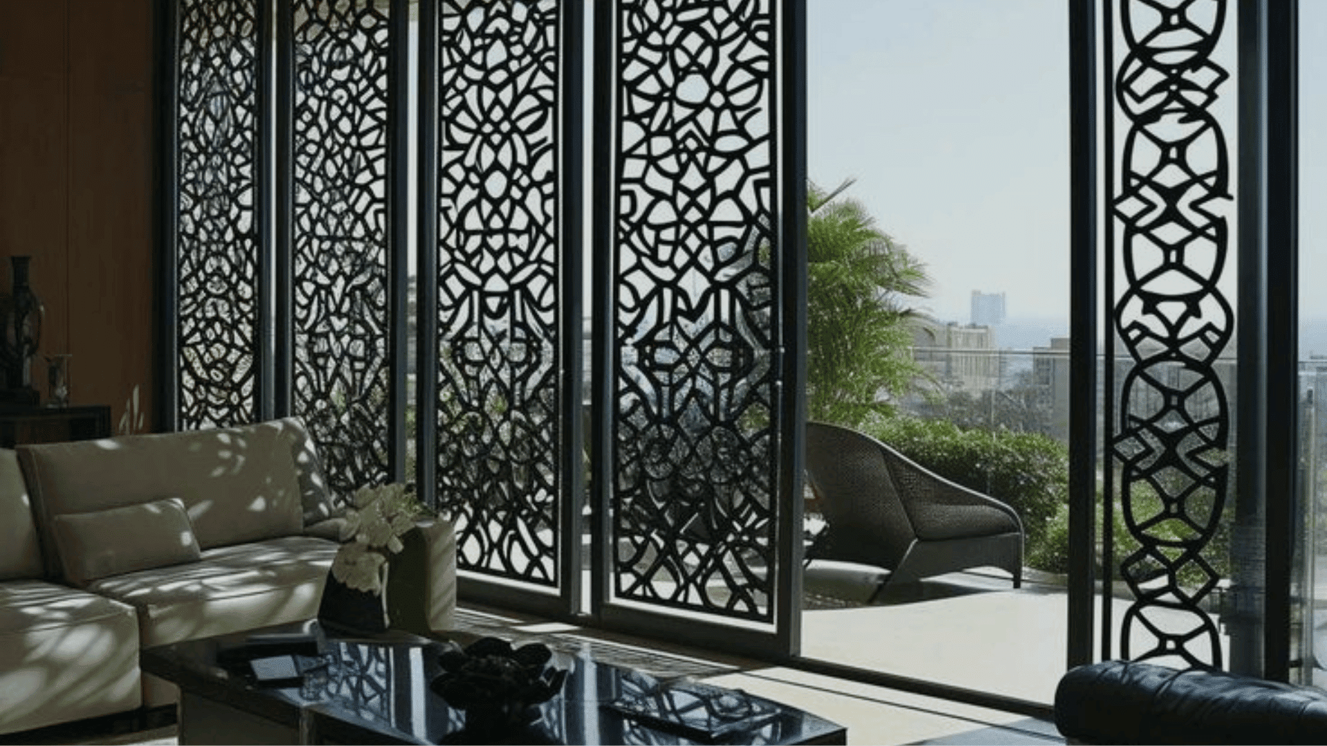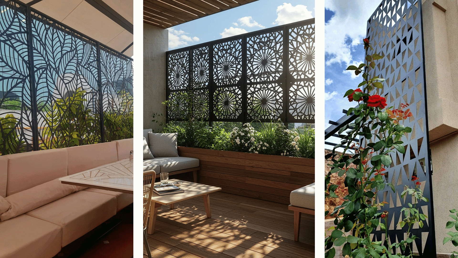 Coberturas: painéis metálicos perfurados servem como brises eficientes, controlando a entrada de luz solar sem bloquear completamente a visibilidade. São soluções inteligentes para varandas, janelas e áreas que necessitam sombreamento controlado.