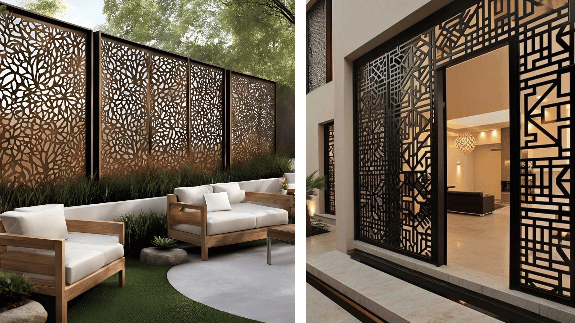 Muros e cercas: substituir muros tradicionais por painéis metálicos vazados ou perfurados mantém privacidade sem bloquear completamente a ventilação e iluminação natural. Designs geométricos ou orgânicos agregam valor estético à propriedade.