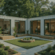 Áreas de lazer e jardins: em espaços externos como piscinas, churrasqueiras e pergolados, os painéis metálicos funcionam como elementos estruturais e decorativos simultaneamente. Criam divisões de ambientes, paredes verdes quando combinados com vegetação ou esculturas arquitetônicas.